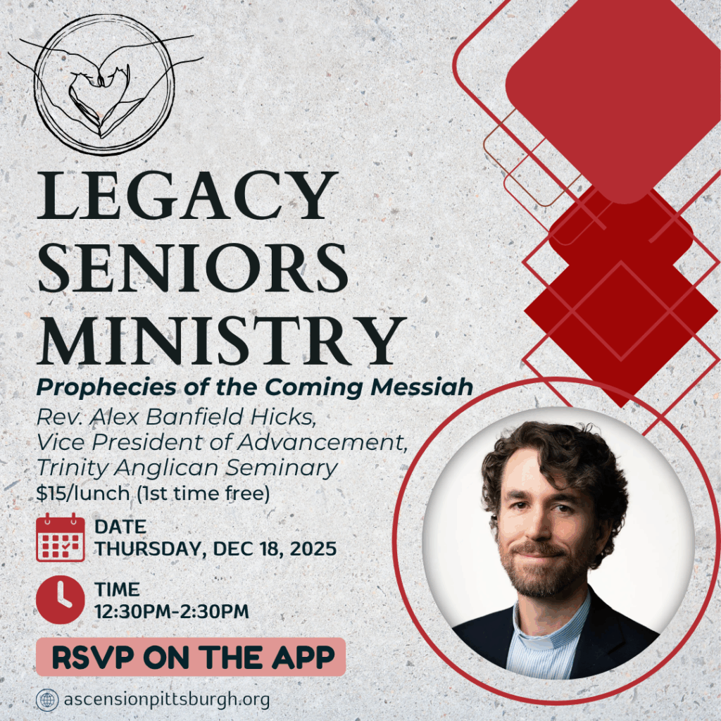 Join with our fellowship of seniors on Thursday, December 18th at 12:30pm as we eat delicious food, sing carols, and enjoy a special Christmas presentation from the Rev. Alex Banfield Hicks, “Prophecies of Jesus in the Old Testament.” Lunch Is $15. First-timers are free. A registration is available on the app or email Kate Fisher to let us know you hope to come! Seniors are especially welcome, but the event is open to the entire parish.