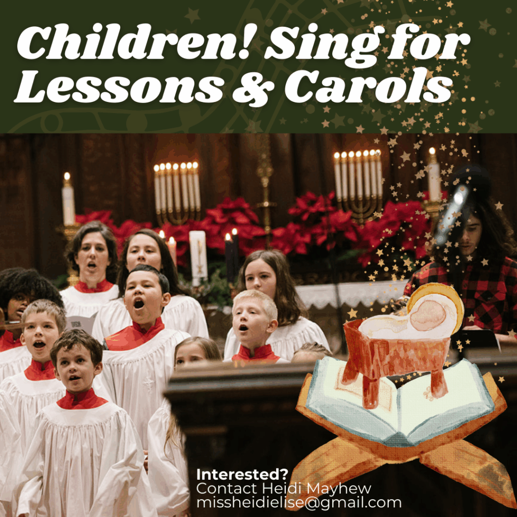 The Children’s Choir will sing for Lessons and Carols for both the 9am and 11am service on December 21. They will be singing the processional hymn and the first lesson and then be dismissed to Children’s Church. The choir is open to grades 1-5. Rehearsals will be the first three Thursdays of December (4, 11, 18). Contact Heidi Mayhew if you would like more information.
